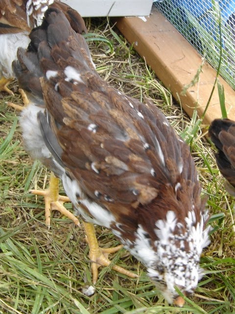 When that occurred, I was in the process of setting up a temporary pen for the hens by attaching it to their pen/coop's opening so that they could venture out into some fresh grass before we move their coop tomorrow. The grass was a bit tall, but they stamped most of it down in no time at all. The tall grass had gone to seed, and they were taking advantage of eating that fresh seed right off the stalks of grass. I would normally not just let them out in a pen like this without being close by to chase off any predators or dogs. I was outside working on the yard/garden so.... they got to explore a little. The hawks were out in full force today, so I added a mesh over the top of the makeshift pen for a little added protection since those guys are stealth! In the photos, you will see that one of the hens is finally starting to show her spangles. :) It's a slow process before they finally spangle.