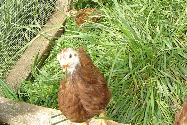 We have more chicks now, than ever. We had the original four Rhode Island Reds that are six weeks old, outside, really, outside, in the sun, in their run and making the adjustment from coop to being in the grass.