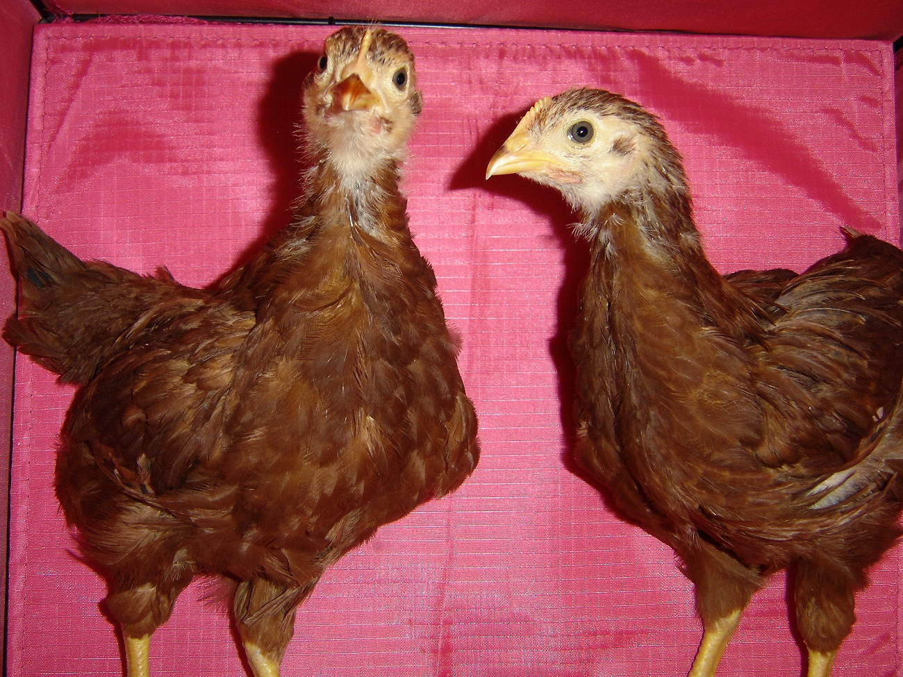 They are growing quickly. They have almost doubled in size even though they do not look like they have. They are much less prone to pasty butt after two weeks, but it can still happen, into their third week. They are still very squatty in appearance. Their beaks are growing stronger and may develop color on the tips, depending on the breed. They are growing more wing feathers, and they are starting to get distinct tail feathers. The interesting things about the Rhodes is that the color on their wings now is not what it will be in a few weeks. After two weeks of age, you can stop feeding the eggs with their feed, and start providing small amount of treats, like chopped up apple, mashed canned corn, or finely chopped broccoli, along with sand or very fine grit twice per week. This helps them to become accustomed to these treats when they get older. (Not too much and not daily. It will mess with their development and egg production, if they get too fat.)